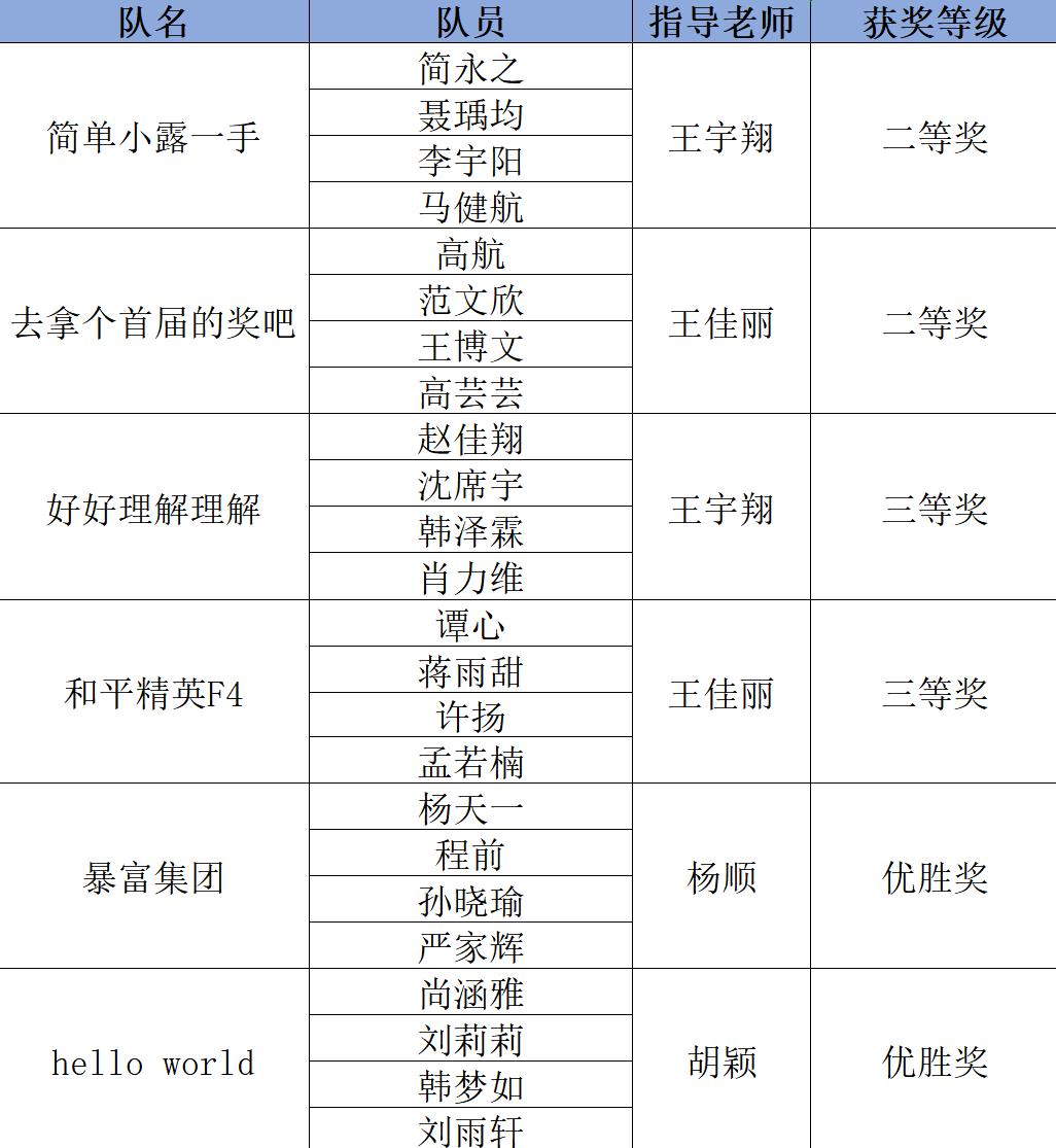 最终,王宇翔老师指导的“简单小露一手”团队和“好好理解理解”团队分别获得二等奖和三等奖,王佳丽老师指导的“去拿个首届的奖吧”团队和“和平精英F4”团队也分别获得二等奖和三等奖。杨顺老师和胡颖老师分别指导的“暴富集团”团队和“hello world”团队荣获优胜奖。决赛的前16强队伍中我们工商外学子占据四分之一,这是属于我们工商外学子的共同的荣誉!
